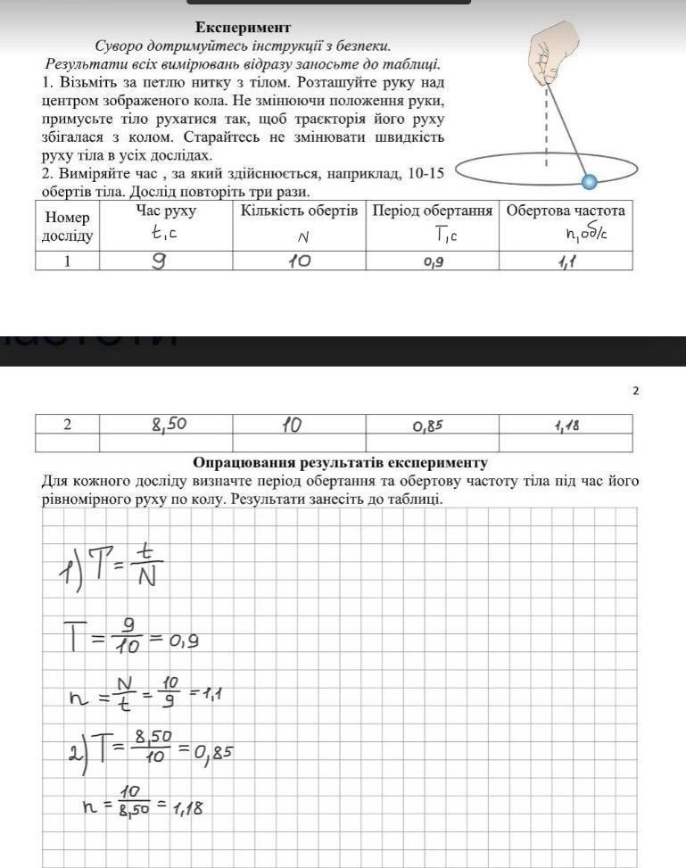 1) Визначали період та обертову частоту тіла під час руху по колу. 2) На точність вимірювань вплинули такі чинники як ціна поділки вимірюваних приборів та людський фактор (швидкість реакції під час зняття показань)