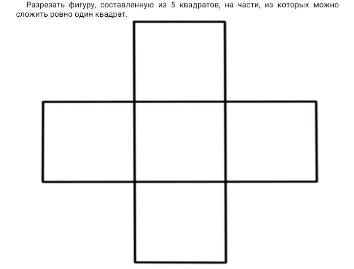 Разрезать фигуру, составленную из 5 квадратов, на части, из которых можно сложить ровно один квадрат.