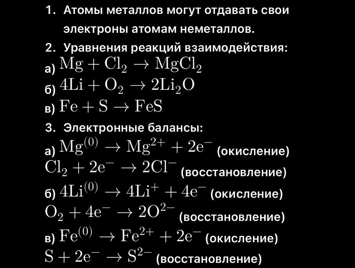 2. Запишите уравнения реакций взаимодействия: а) магния с хлором; б) лития с кислородом; в) железа с серой.