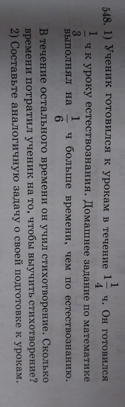 3) 9-7- 548. 1) Ученик готовился к урокам в течение 1 ч. Он готовился 4 ч к уроку естествознания. Домашнее задание по математике 3 ВЫПОЛНЯл на ч больше времени, чем по естествознанию. 1 6 В течение остального времени он учил стихотворение. Сколько времени потратил ученик на то, чтобы выучить стихотворение, 2) Составьте аналогичную задачу о своей подготовке к урокам. 12 3