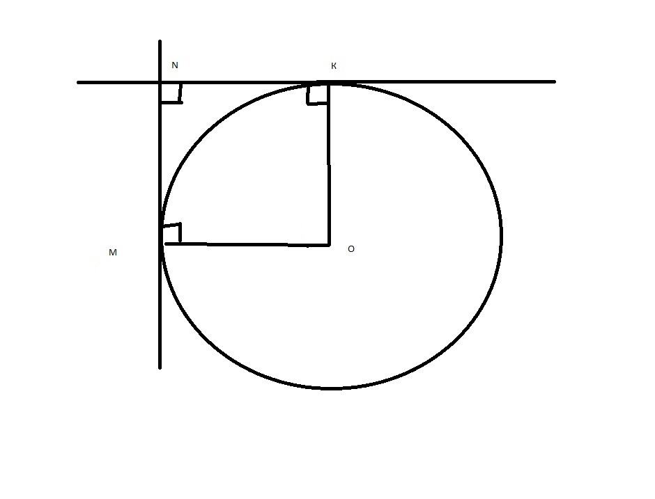 Опускаем перпендикуляры из К и М, угол МОК =90 (K=M=N=90), т.е. О ц окр. т.к. перпендикуляры от касательных пересекаются в ц.окр.,т.е мы получаем квадрат.