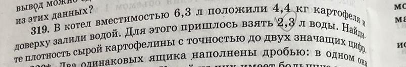 319. В котел вместимостью 6,3 л положили 4,4 кг картофеля и те плотность сырой картофелины с точностью до двух значащих цифр. 2,3л. воды. линаковых ящика наполнены дробью: в одном на плотность вывод можно сделать на этих данных? СРОЧНО Я В ШКОЛУ ОПАЗДЫВАЮ ЗА 7 КЛАСС