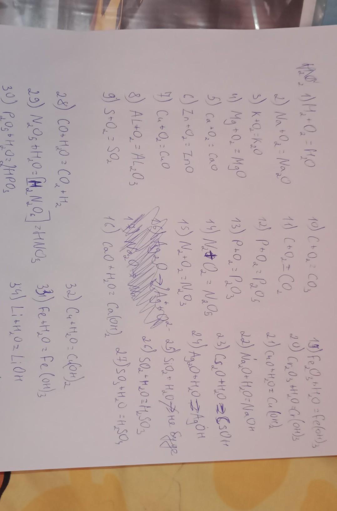 1.2H₂+0₂ 2. Na+ O₂ = 3. K+0₂= 4. Mg+O, 5. Ca + O₂ = 6. Zn+0₂= 7. Cu + 0₂ - 8. Al + O₂ = 9. S+0₂= 10. C + O₂(23) - 11. C+0₂- 12. P + O₂ = 13. P + O₂- 14. N₂ + O₂ = 15. N₂ + O₂ = 16. 2Ag₂01 17. Na₂01 18. CaO + H O 19. Fe₂O3 + H₂O= 20. Cr₂O3+ H₂O- 21. CuO + H₂O= 22. Na₂O + H₂O= 23. Cs₂O + H₂O- 24. Ag₂O + H₂O= 25. SiO₂ + H₂O= 26. SO₂ + H₂O- 27. SO3 + H₂O= 28. CO, +H_O= 29. N₂O5 + H₂O= 30. P₂O5 + H₂O= 31. K +H₂O = 32. Cu +H₂O= 33. Fe +H₂O = 34. Li +H O= 35. Mg +H₂O6y= 36. Mg +H₂O = 37. Zn +H₂O= 38. Zn+ 2HCl = 39. K+ H₂SO4(c) 40. Ag + HCl 41. Fe + HCl = 42. Mg + H₂SO4(c) 43. Mg + H₂SO4(k) 44. Cu+ H₂SO4(k)= -