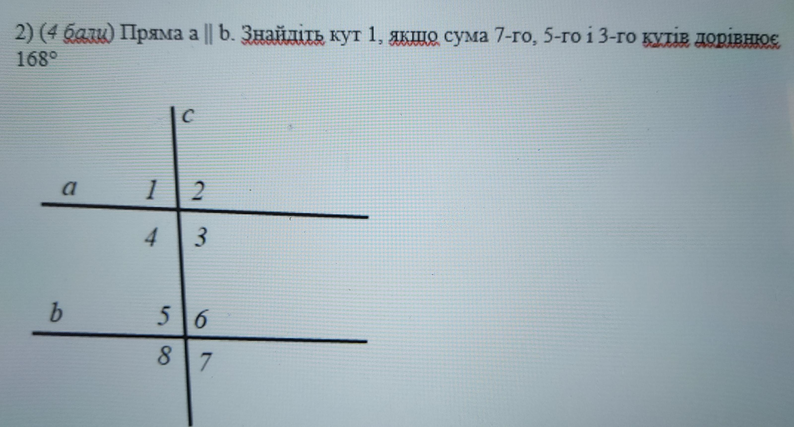 (50 балів) пряма а || b. знайдіть кут 1, якщо сума 7-го 5-го і 3-го кутів дорівнює 168°