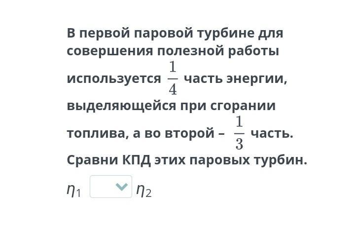 в первой паровой турбине для совершения полезной работы используется 1\4 часть энергии, выделяющейся при сгорании топлива, а во второй - 1\3 Сравни КПД этих паровых турбин.