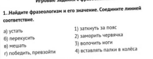А-3,Б-2.В-4.Г-1 устать-волочить ноги,перекусить-заморить червяка,мешать-вставлять палки в колеса,победить-заткнуть за пояс
