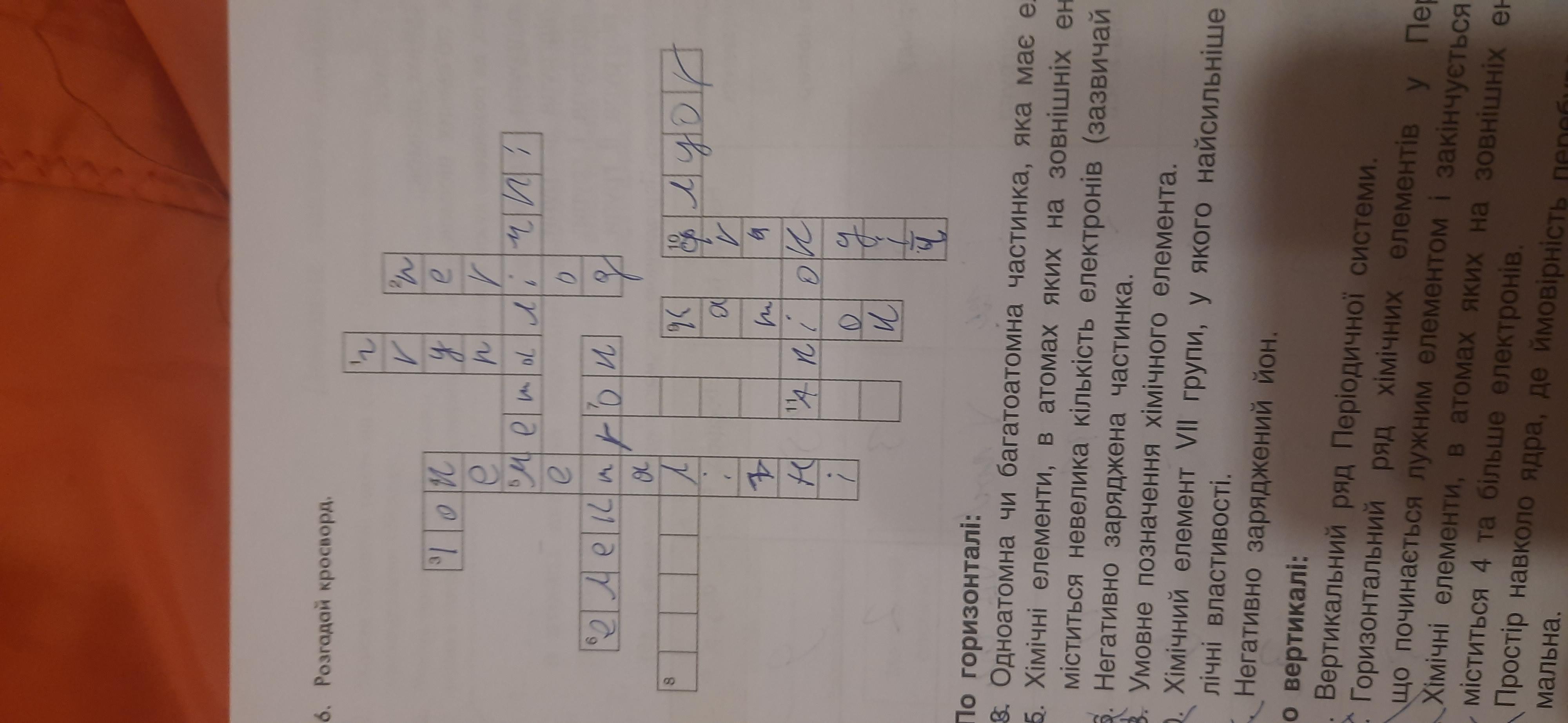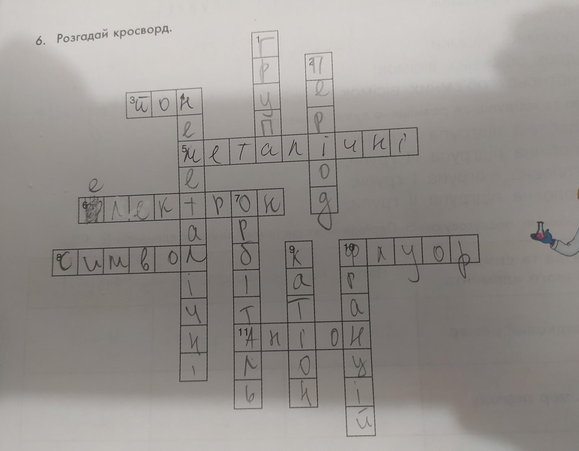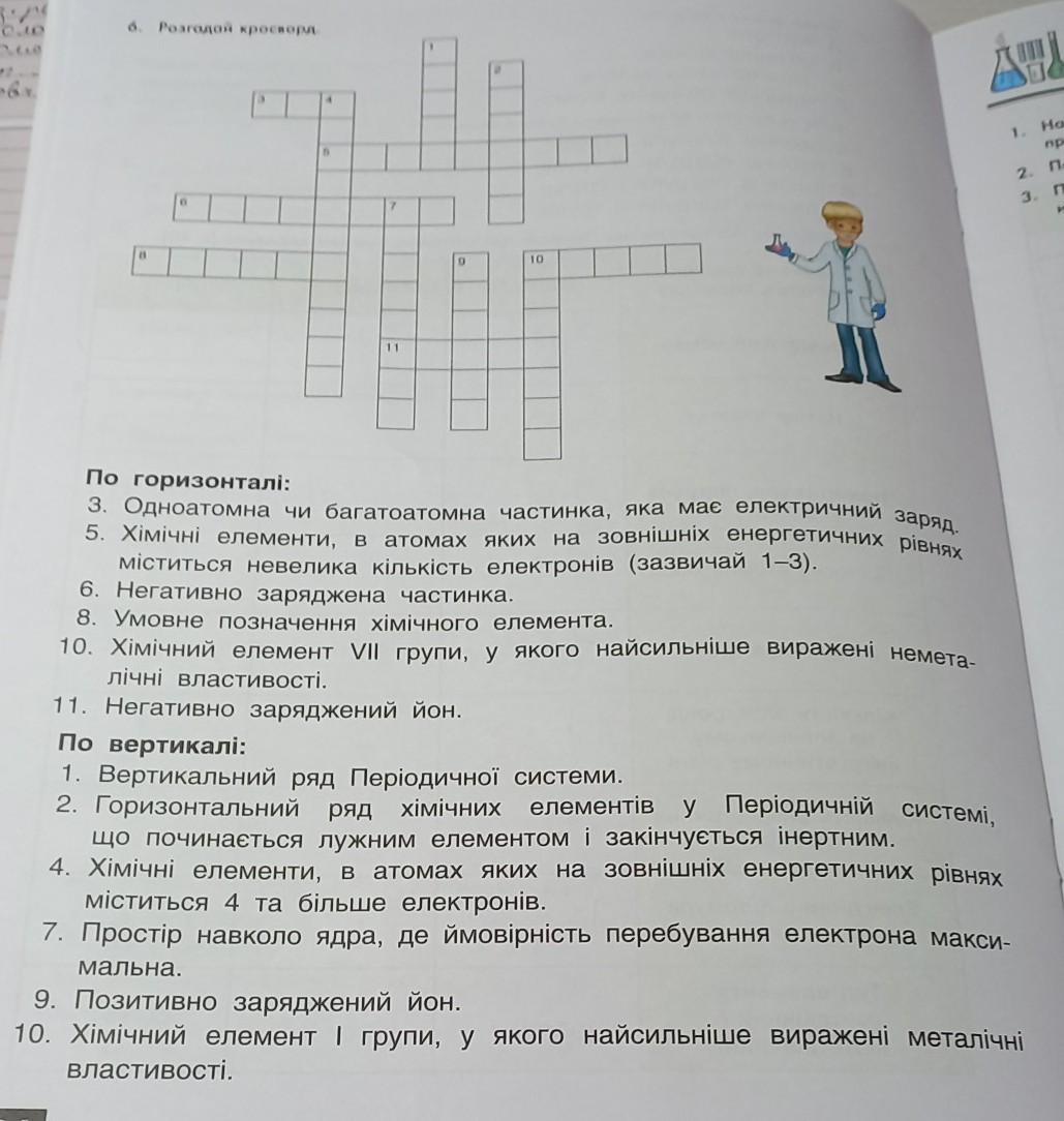 8 4 10 23 По горизонталі: 3. Одноатомна чи багатоатомна частинка, яка мае електричний заряд 5. Хімічні елементи, в атомах яких на зовнішніх енергетичних рівнях міститься невелика кількість електронiв (зазвичай 1-3). 6. Негативно заряджена частинка. 8. Умовне позначення хiмiчного елемента. 10. Хімічний елемент VII групи, у якого найсильніше вираженi немета лічні властивості. 11. Негативно заряджений йон. По вертикалі: 1. Вертикальний ряд Перiодичної системи. 2. Горизонтальний ряд хімічних елементів у Періодичній систем що починається лужним елементом і закінчується інертним. 4. Хімічні елементи, в атомах яких на зовнішніх енергетичних рiв міститься 4 та бiльше електронів. 7. Простір навколо ядра, де ймовірність перебування електрона ме мальна. 9. Позитивно заряджений йон. 10. Хімічний елемент 1 групи, у якого найсильніше виражені мет властивості.