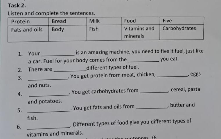 1. Your **body** is an amazing machine, you need to **give** it fuel, just like a car. Fuel for your body comes from the **food** you eat.
