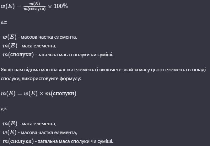 масова частка-величина безрозмірна.Часто її вирають у відсотках. сума масових часток усіх.елементів у сполуці становить 1(100%).за відомою масовою часткою одного з елементів можно розрахувати його масу в складі сполук з формули (1)випливає M(E)=w(E)•m(сполуки)