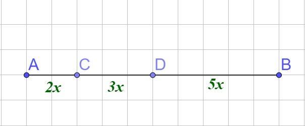 Нехай АС = 2х, СD = 3х, DВ = 5х, де х - коефіцієнт пропорційності.