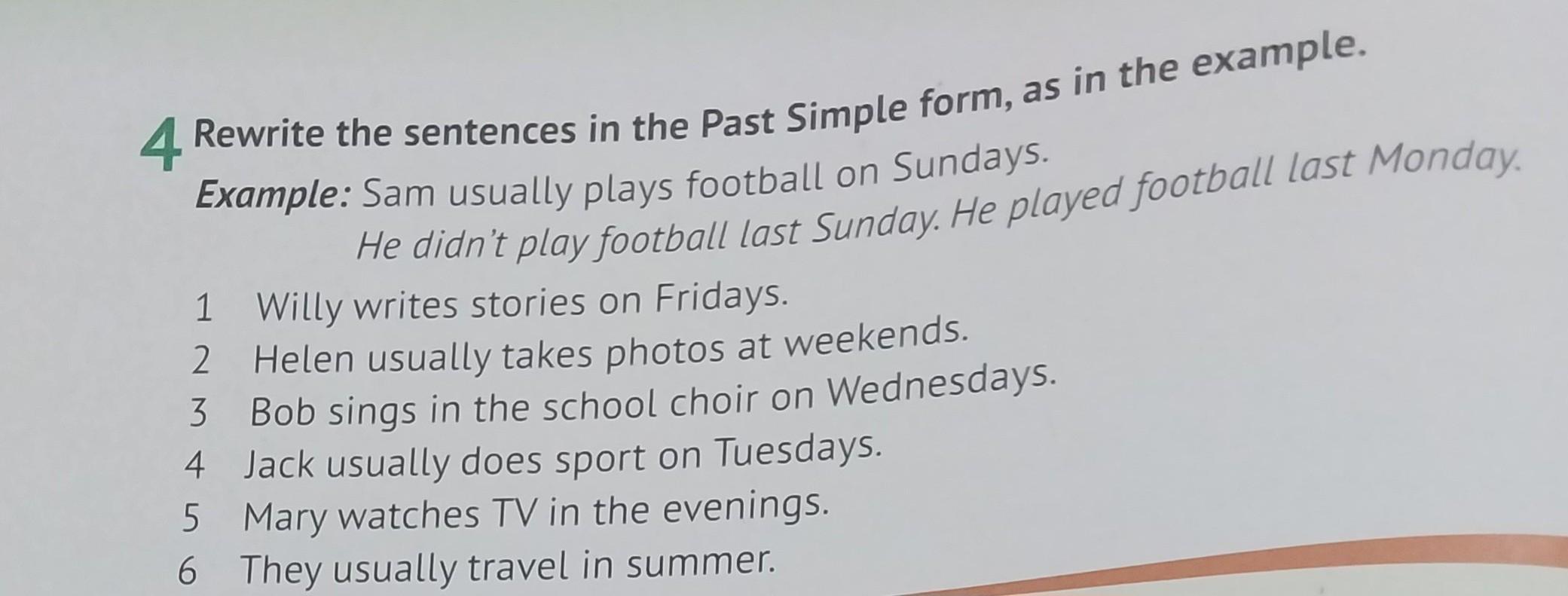 Пояснення: Сначала переписываешь предложение, а снизу пишешь как в примере. Он не писал истории прошлую пятницу, он играл в волейболл последний понедельник. Вместо волейбола и понедельника пишешь что хочешь, можно и вышел погулять, играл в теннис, спал итд. Вместо понедельника любой день недели кроме