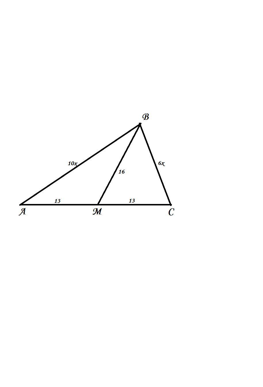 Дано: ΔАВС, АС=26 см, АВ:ВС=10:6; ВМ - медіана, ВМ=16 см. АВ - ?