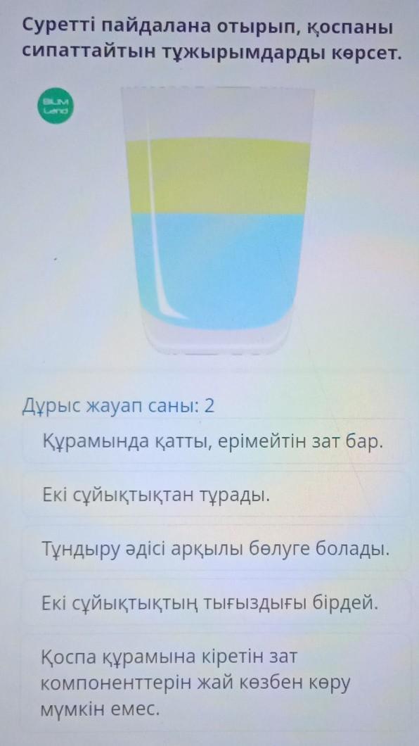 Суретті пайдалана отырып, қоспаны сипаттайтын тұжырымдарды көрсет. кому срочно жаратылыстану 5 сынып