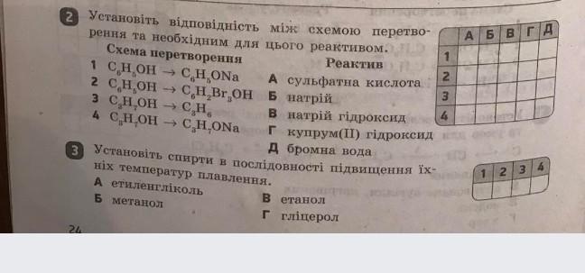 Становiть вiдповiднiсть мiж схемою перетво- рення та необхiдним для цього реактивом. Реактив Схема перетворення 1 C HOH → C H.ONa 2 CH OH 3 с.н.он 4 C,H,OH → C,H,ONa А сульфатна кислота → C H Br, OH Б натрій - C.H. в натрій гідроксид г купрум(II) гідроксид Д бромна вода 101 3 Установіть спирти в послідовності підвищення їх- ніх температур плавлення. А етиленгліколь Б метанол В етанол г гліцерол 1 Nm 2 3 А Б В Г Д 1 2 3 4