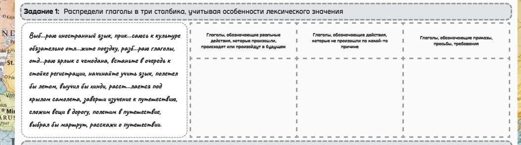 обозначает реальное действие: выбираю иностранный язык, прикасаюсь к культуре,разбираю глаголы,отдираю ярлык с чемодана, расстелается под крылом самолета, сложим вещи в дорогу, полетим в путешествие