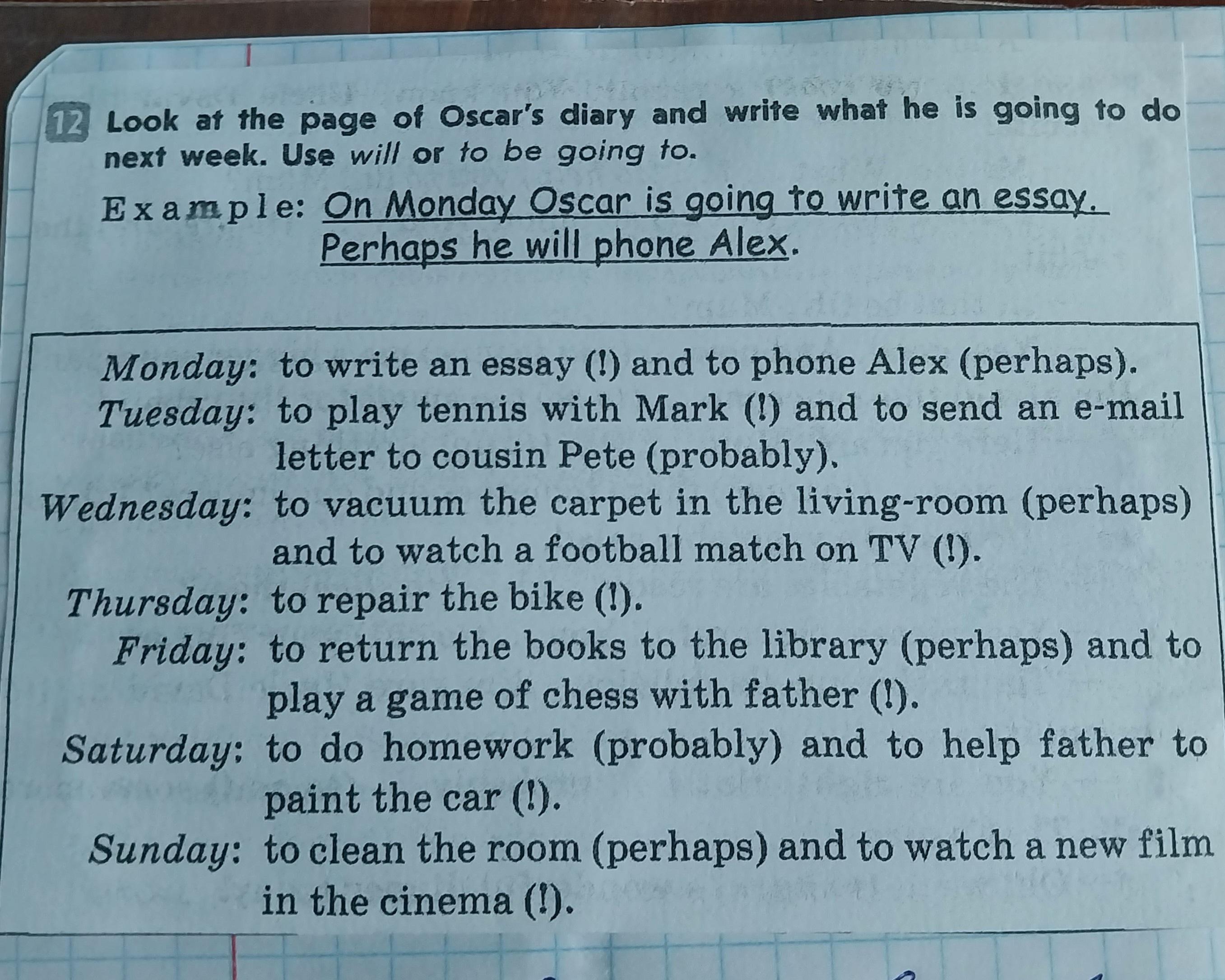 Tuesday: Oscar is going to play tennis with Mark and probably send an email to cousin Pete.