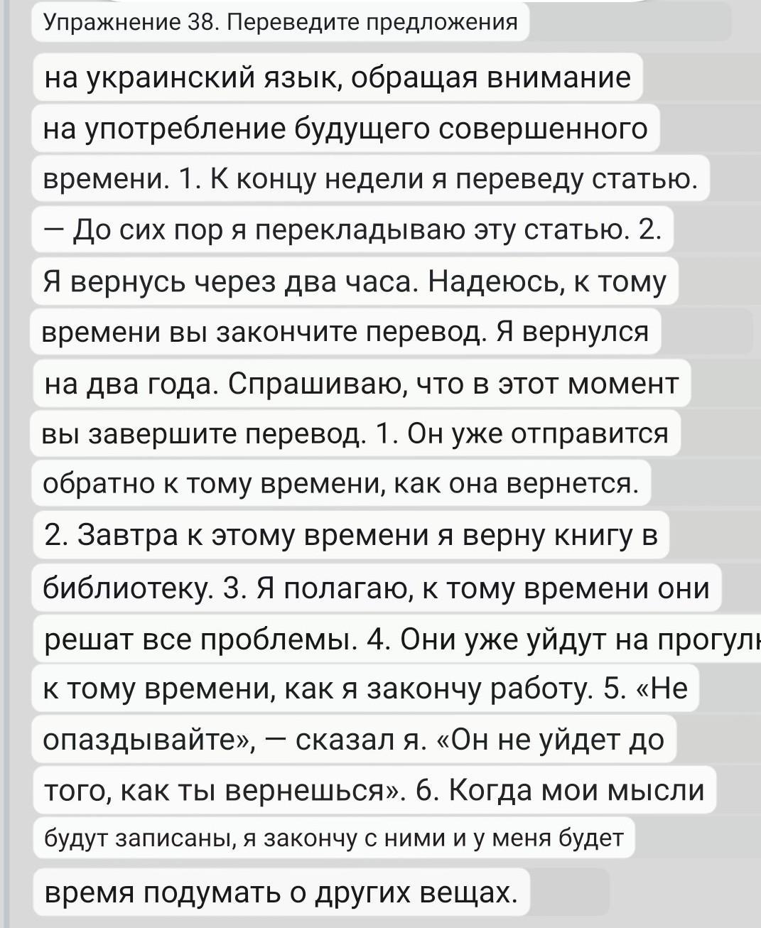 Exercise 38. Translate the sentences into Ukrainian paying attention to the use of the Future Perfect Tense. 1. By the end of the week I shall have translated the article. — До кінця тижня я перекладу цю статтю. 2. I’ll be back in two hours. I hope you will have finished the translation by then. — Я повернуся за дві години. Сподіваюсь, що до цього часу ви закінчите переклад. 1. He will have started on his way back by the time she returns. 2. I shall have returned the book to the library by this time tomorrow. 3. I suppose by then they will have settled all the problems. 4. They will have gone for a walk by the time I finish the job. 5. «Don’t be late,» I said. «He won’t have gone before you come back.» 6. When my thoughts are written down I shall have finished with them and I shall have time to think of other things.