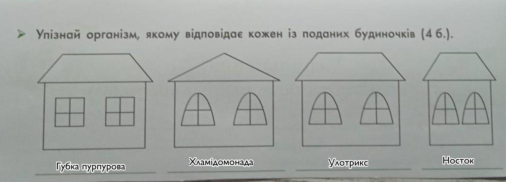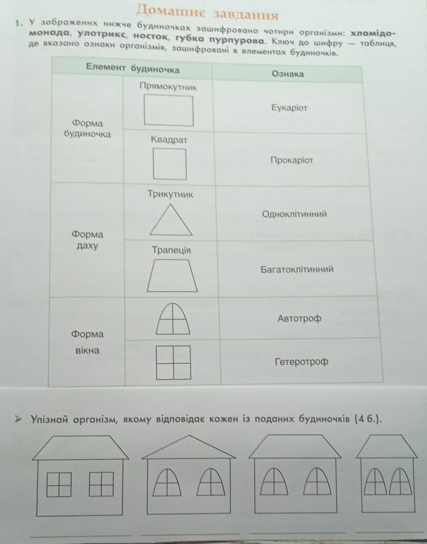 таблиця, 1. У зображених нижче будиночках зашифровано чотири організми: хламідо- монада, улотрикс, носток, губка пурпурова. Ключ до шифру де вказано ознаки організмів, зашифровані в елементах будиночків.