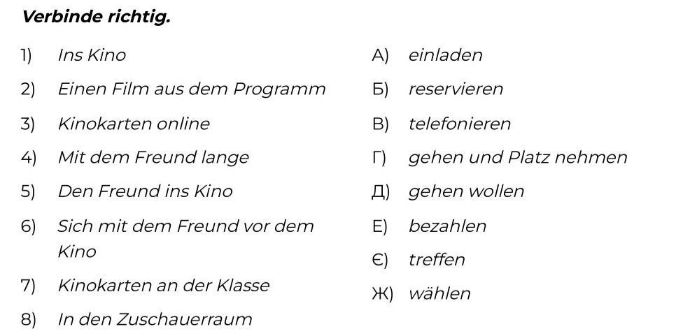 6) Sich mit dem Freund vor dem Kino **treffen.**