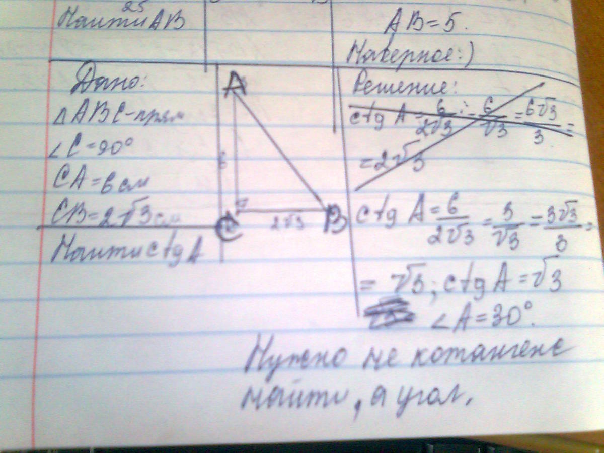 В треугольнике АВС угол С=90°. СА= 6 см, СВ=2корень из 3 см. Найти ctg A