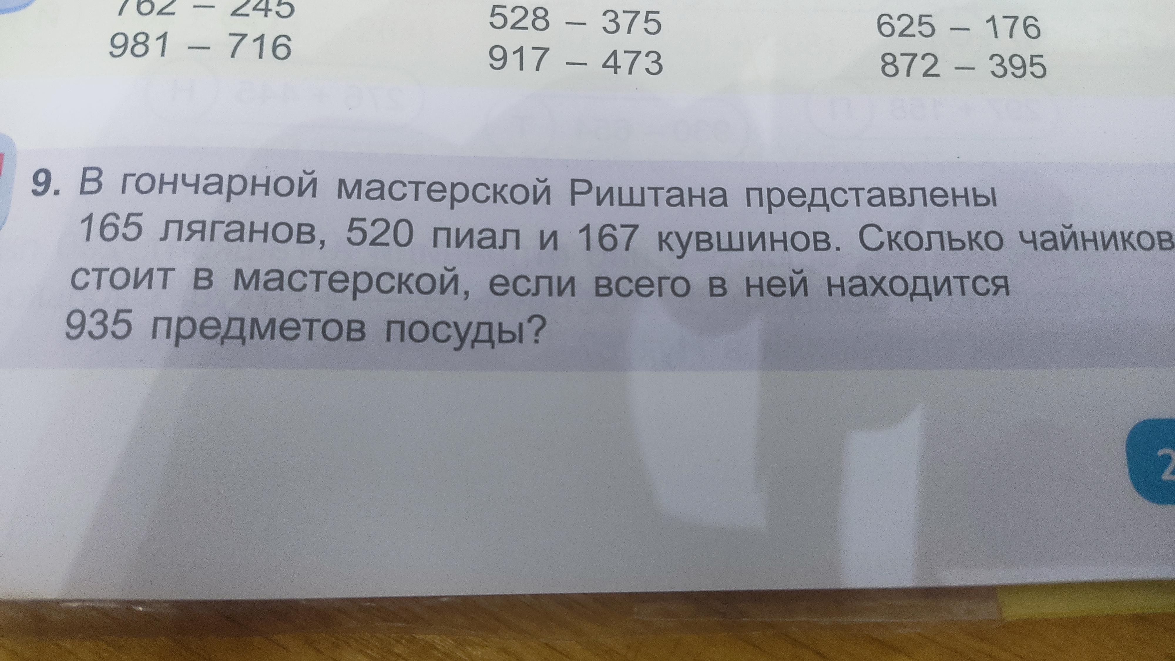 Объяснение: если в мастерской 935 предметов из которых 852 это лягал , пиала и кувшин , то остальные это чайники