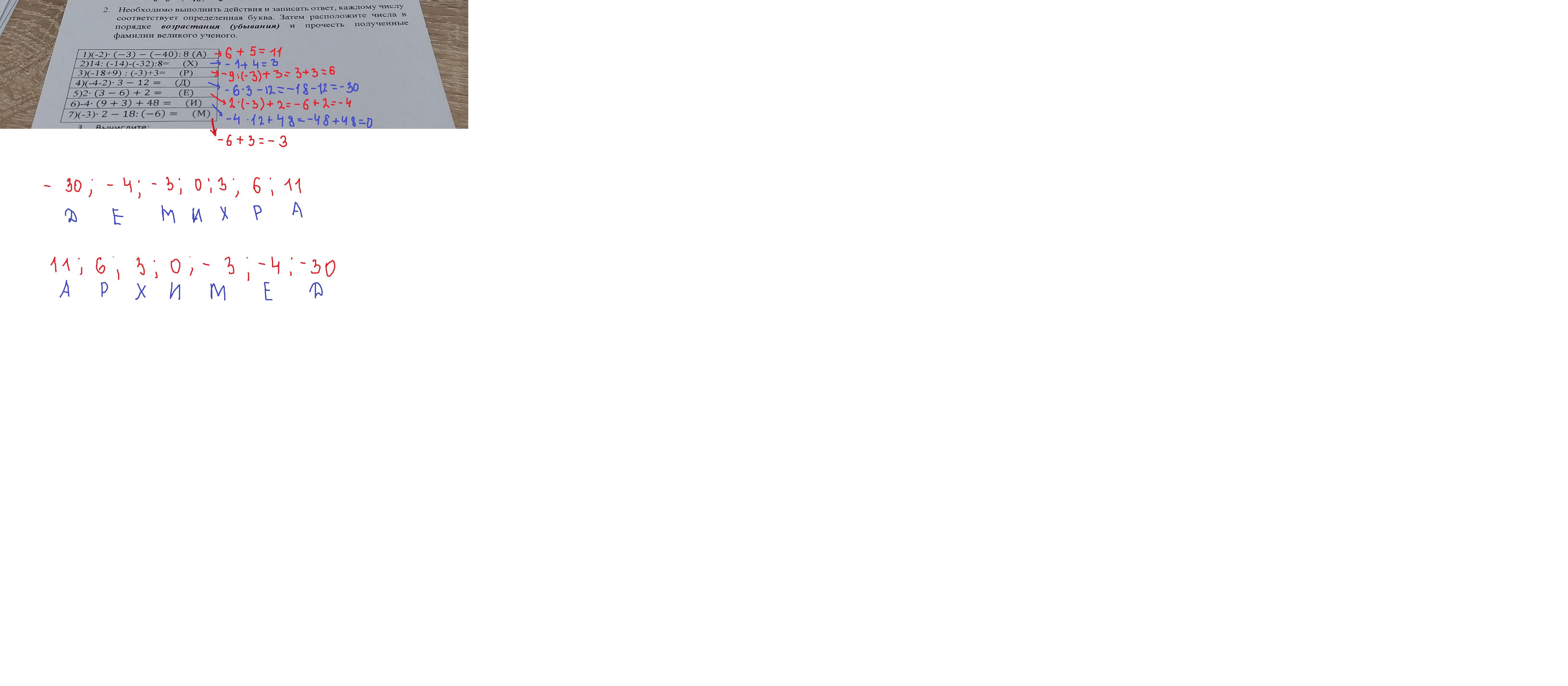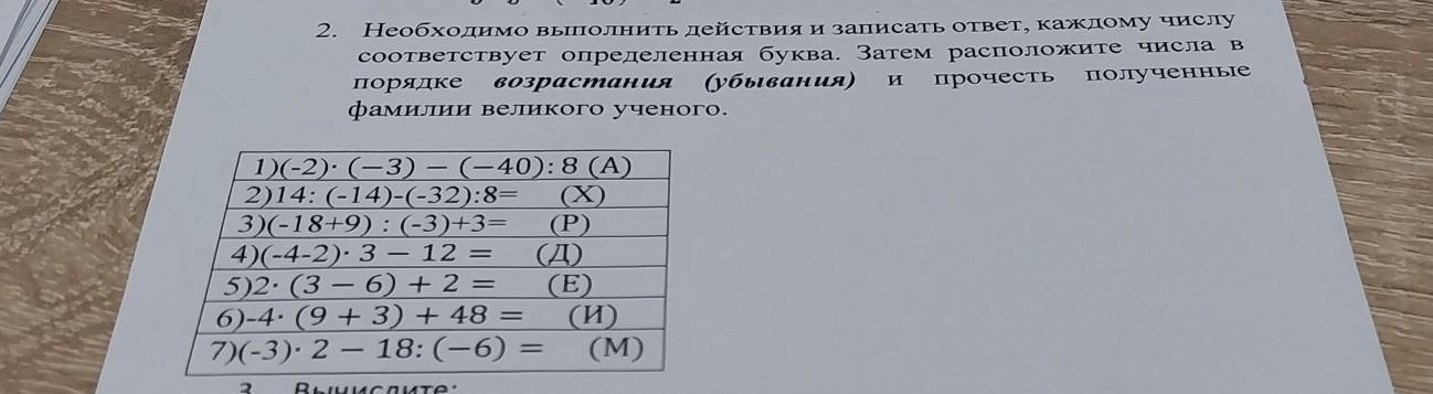 2. Необходимо выполнить действия и записать ответ, каждому числу соответствует определенная буква. Затем расположите числа в порядке (убывания) и прочесть полученные возрастания фамилии великого ученого. (X) 1)(-2) (-3) - (-40): 8 (A) 2)14: (-14)-(-32):8= 3)(-18+9) (-3)+3= 4)(-4-2) 3 - 12 = 5)2 (3-6) + 2 = 6)-4 (9+ 3) + 48 = 7)(-3) 2 18: (-6)= (P) (Д) (E) (И) (M) ЗАВТРА КОНТРАХА 6КЛАСС СРОЧНО!!!!!