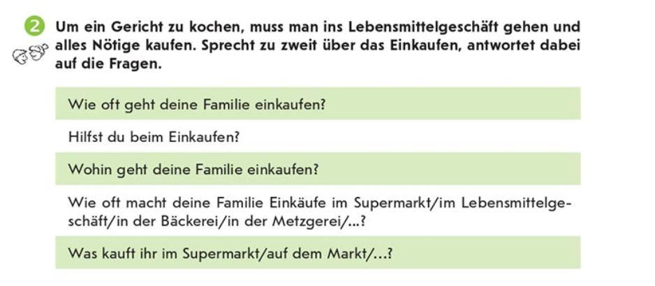 Meine Familie geht im Supermarkt einmal pro Woche. Sie geht im Lebensmittelgeschäft einmal pro Woche. Sie geht in der Bäckerei selten. Sie geht in der Metzgerei nicht sehr oft.