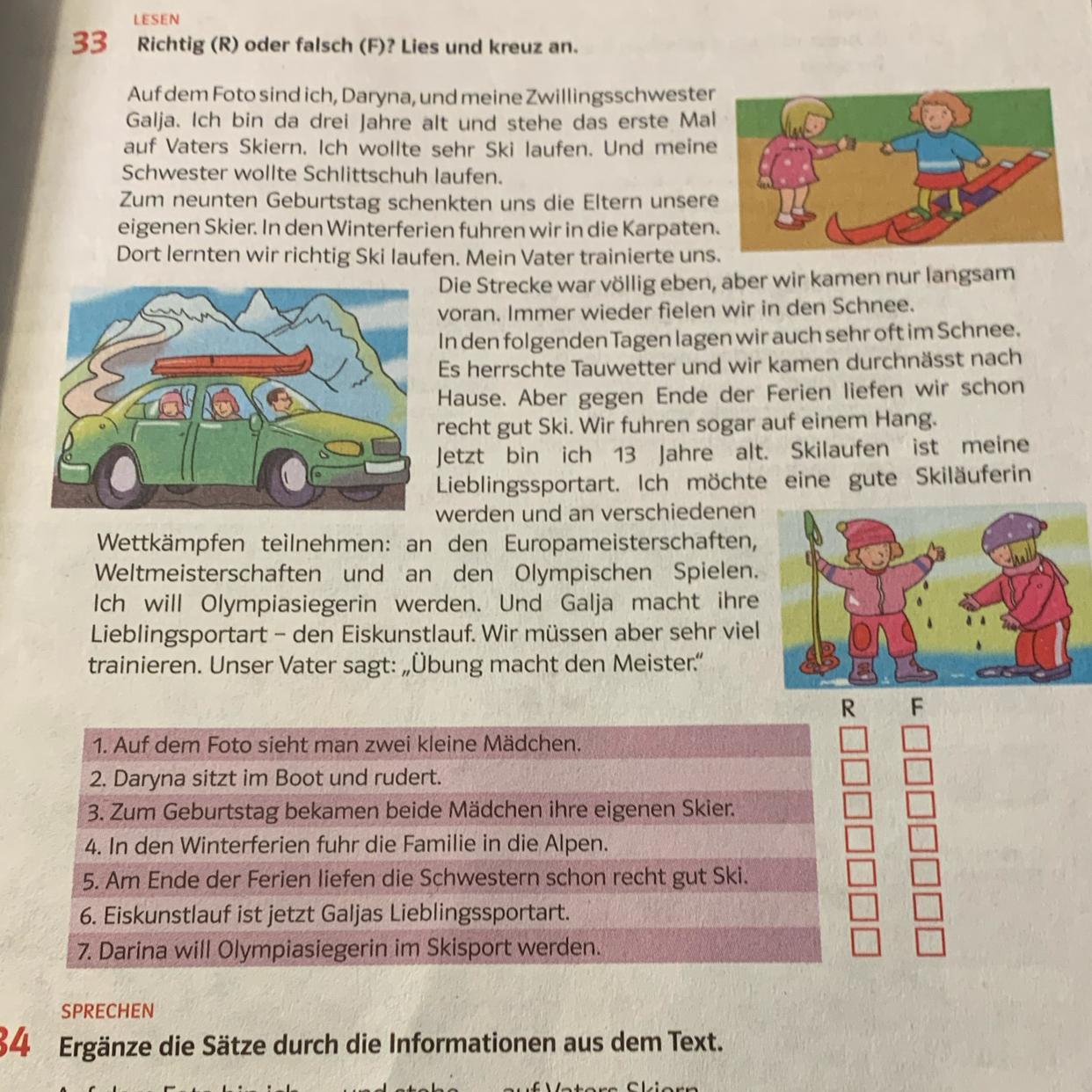 1. На фото ви бачите двох маленьких дівчаток.2. Дарина сидить у човні і веслує.3. Обидві дівчинки отримали на день народження власні лижі.4. Під час зимових канікул родина поїхала в Альпи.5. Наприкінці канікул сестри непогано каталися на лижах.6. Фігурне катання тепер улюблений вид спорту Галі. 7. Дарина хоче стати олімпійською. чемпіонкою з лижного спорту.