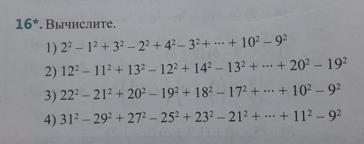 16*. Вычислите. 1) 2²-1² +3²-2² +4²-32+...+ 10² - 9² 2) 12² - 11²+ 13² - 12² + 14²-13² ++20² - 19² 3) 22²-21² +202 - 192 + 18² - 17²+ + 10² - 9² 4) 31²-292 +272-252 + 23²-21²++11²-92 ...