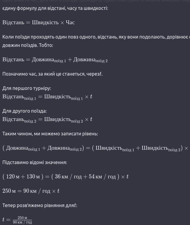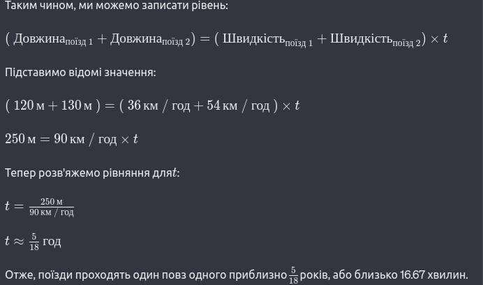 2 поїзди їдуть назустріч один одному по паралельних коліях зі швидкістю 36 км/год і 54 км/год. Довжина поїздів 120м і 130м. За який час поїзди проїдуть один повз одного.