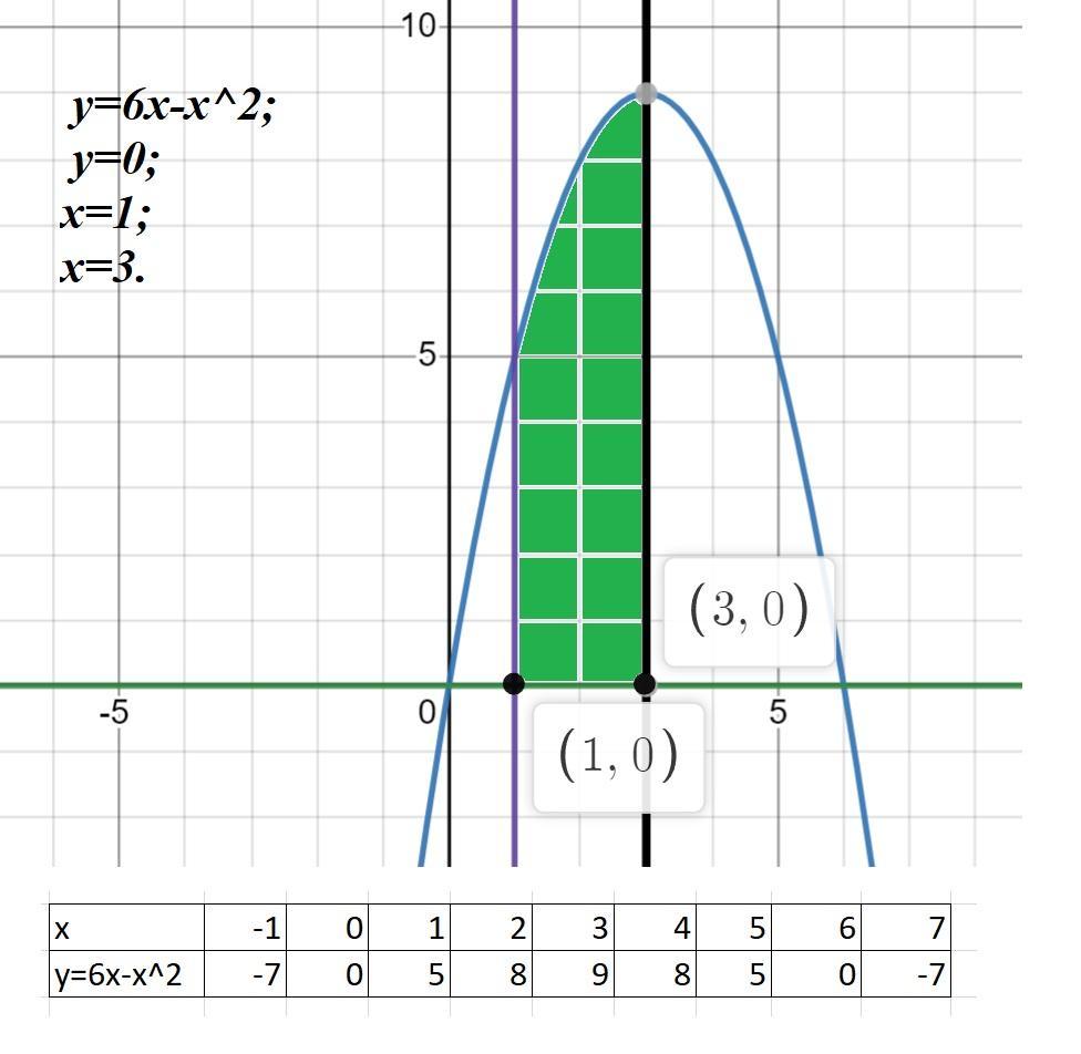 Строим графики функций y=6x-x^2; y=0; x=1; x=3. (См. скриншот)