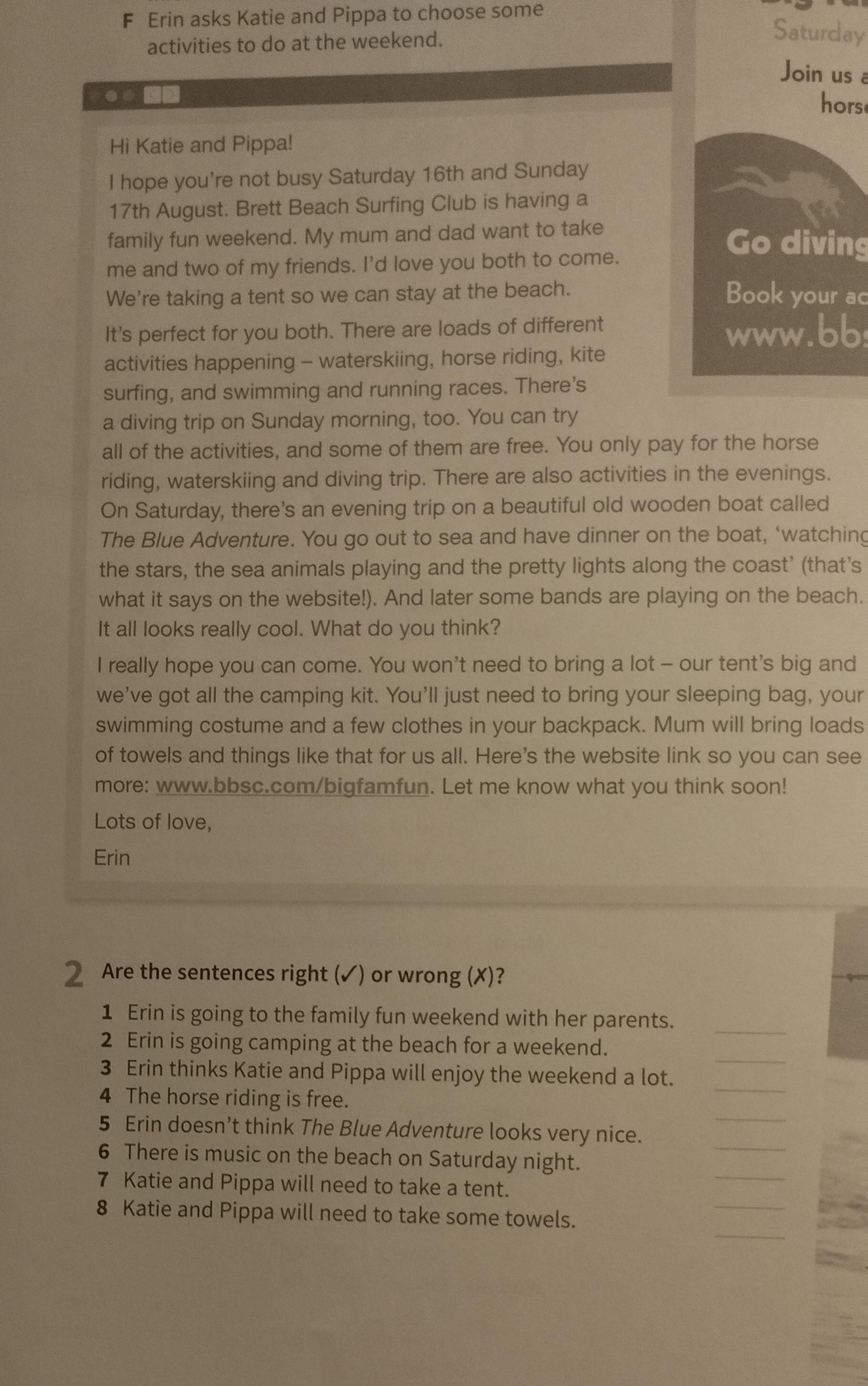 Right (✔) - Erin mentions taking a tent for camping at the beach.