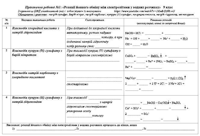 Реактиви: хлоридна кислота НСl, розчини натрій карбонату Na2CO3, калій хлориду КСl, кальцій хлориду СаСl2, барій хлориду ВаСl2, магній хлориду MgCl2, калій броміду КВr, калій йодиду КI, калій ортофосфату К3РО4, натрій сульфату Na2SO4, натрій сульфіту Na2SO3, арґентум нітрату AgNO3, сульфатної кислоти H2SO4, натрій гідроксиду NaOH, лакмусу або метилового оранжевого.