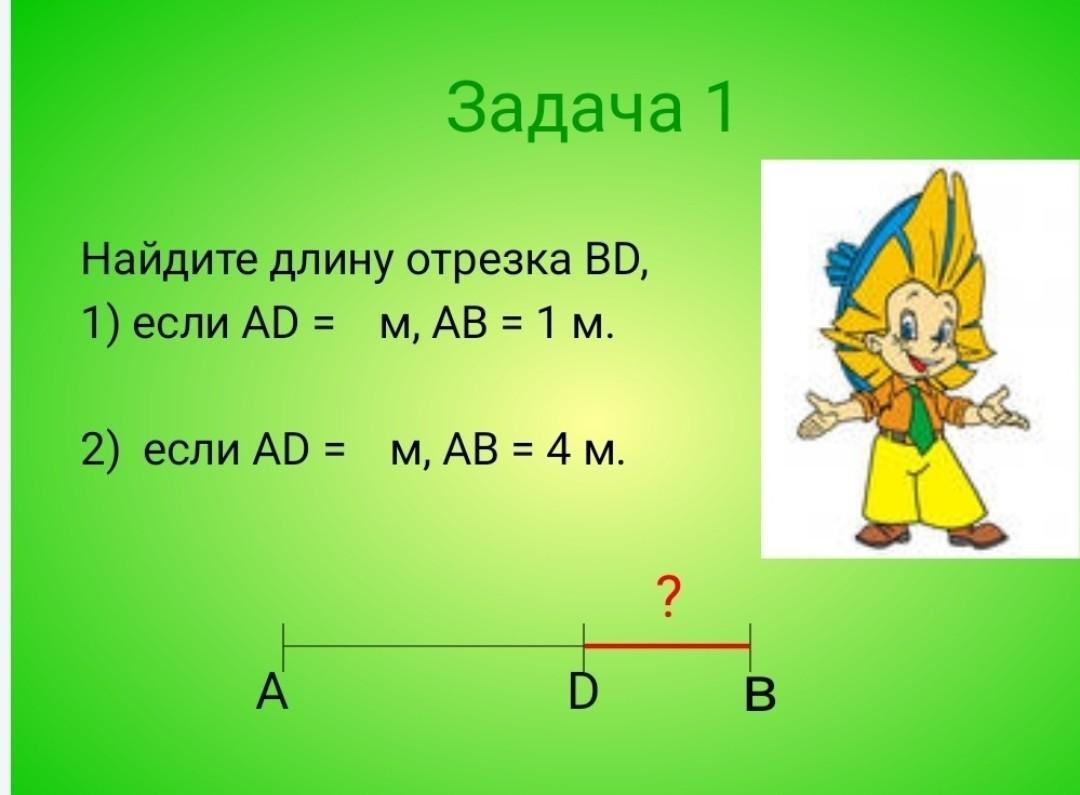 Найдите длину отрезка BD, 1) если AD = м, АВ = 1 м. 2) если AD = Задача 1 A M, AB = 4 м. D ? B
