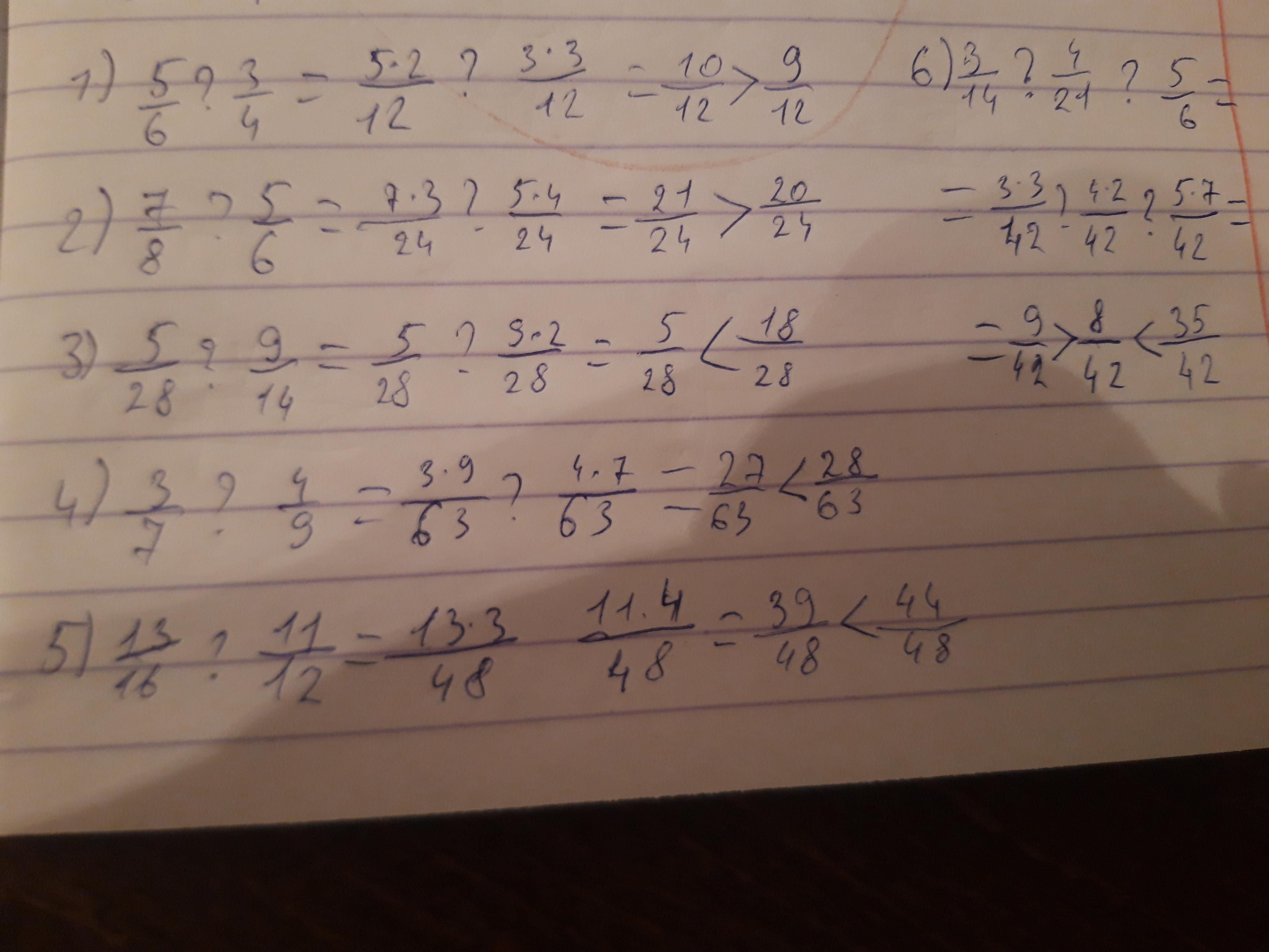 1) 5/6 и 3/4= 10/12 > 9/12
