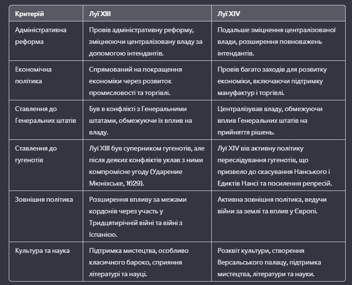 Створити порівняльну таблицю "Франція у період правління Луї XIII і Луї XIV". Порівняти за наступними критеріями: адміністративна реформа, економічна політика, ставлення ло Генеральних штатів, ставлення до гугенотів, зовнішня політика, культура та наука.