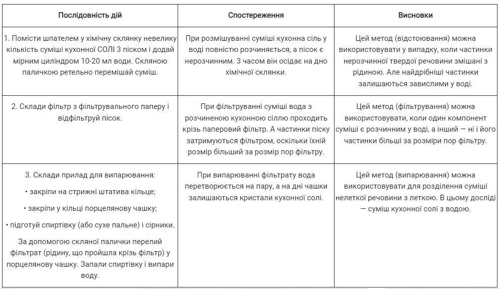 1. В роботі послідовно використані два способи розділення сумішей: фільтрація та випарювання.