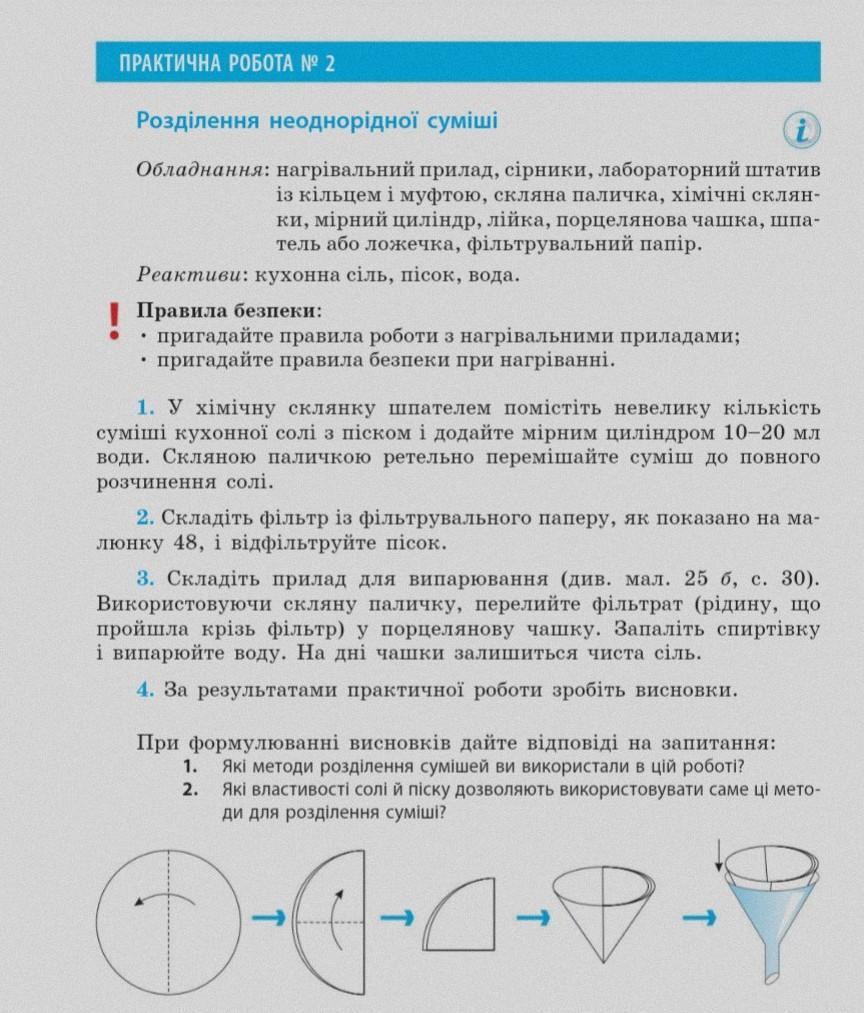 2. Фільтрацію застосували, оскільки один з компонентів суміші є розчинним (кухонна сіль), а інший не розчиняється у воді (пісок). Випарювання використали, оскільки розчинник (вода) є леткою речовиною, а розчинена речовина (кухонна сіль) — ні.