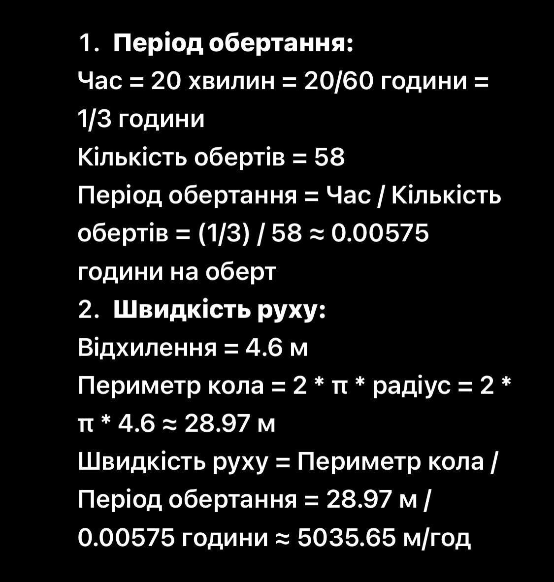 Рома і Лєна катаються на каруселях. В деякий момент рух стає рівномірним і сидіння каруселi вiдхиляються на відстань 4,6 м вiд обертального стовпа. Знайди, з якою швидкістю рухаються діти, якщо за 20 хвилин карусель обертається 58 разів. Вкажи яким є період обертання каруселі? (Результати обчислень округлюй до сотих) Відповідь: швидкість руху дорівнює Перiод обертання каруселі: C M KM год