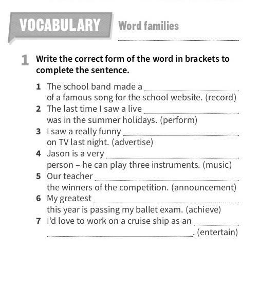 Ответ:1)record 2)performed 3)advertise 4)musical 5)announcements 6)achieve 7)