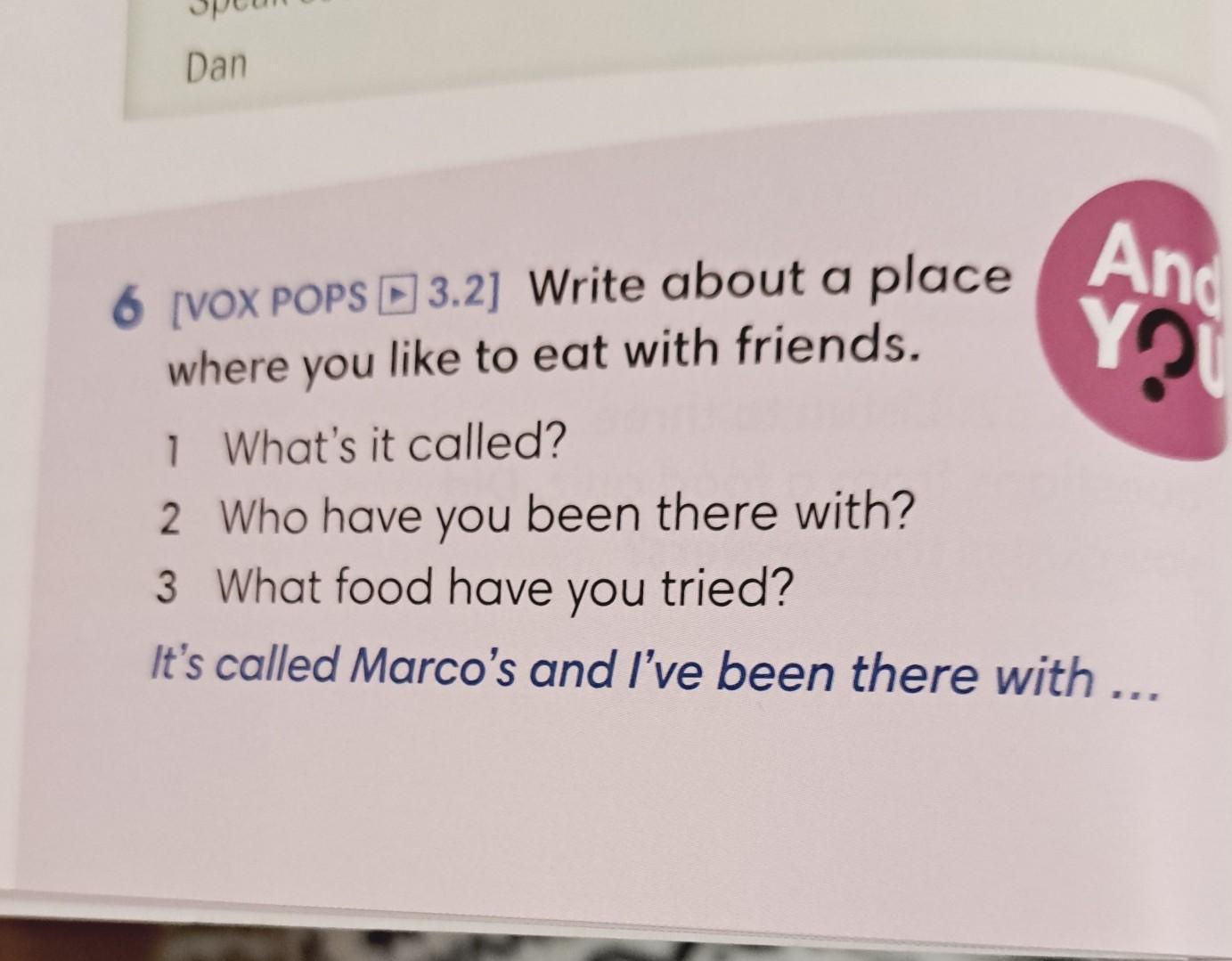 Write about a place where you like to eat with friends. 1 What's it called? 2 Who have you been there with? 3 What food have you tried?