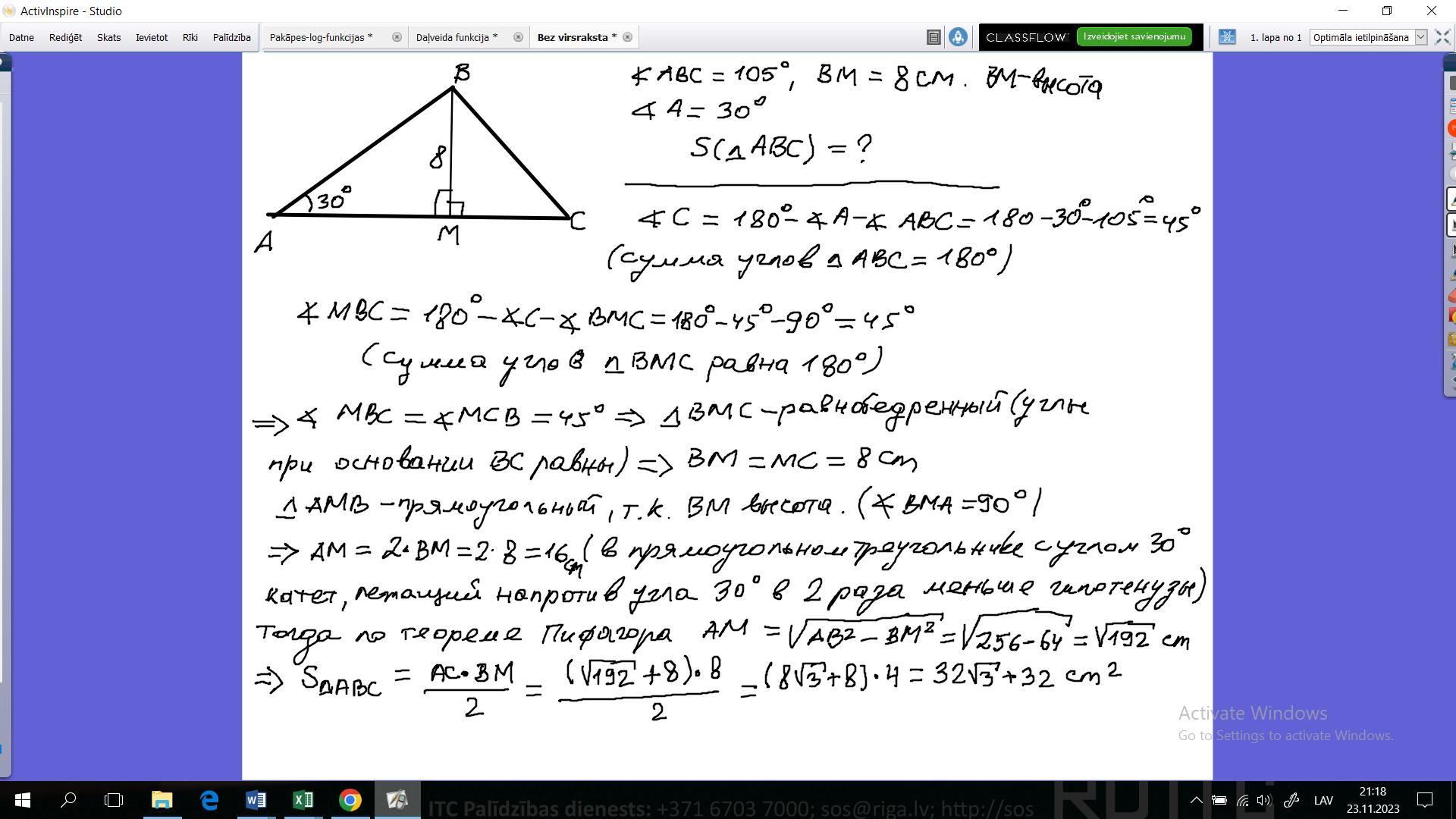 Відрізок ВМ висота трикутника ABC, BM = 8см , кут A=30градусів , кут ABC = 105 градусів. Знайти площу трикутника ABC. (Отрезок ВМ высота треугольника ABC, BM=8см, угол A=30градусов, угол ABC=105 градусов. Найти площадь треугольника ABC.)
