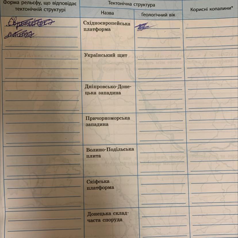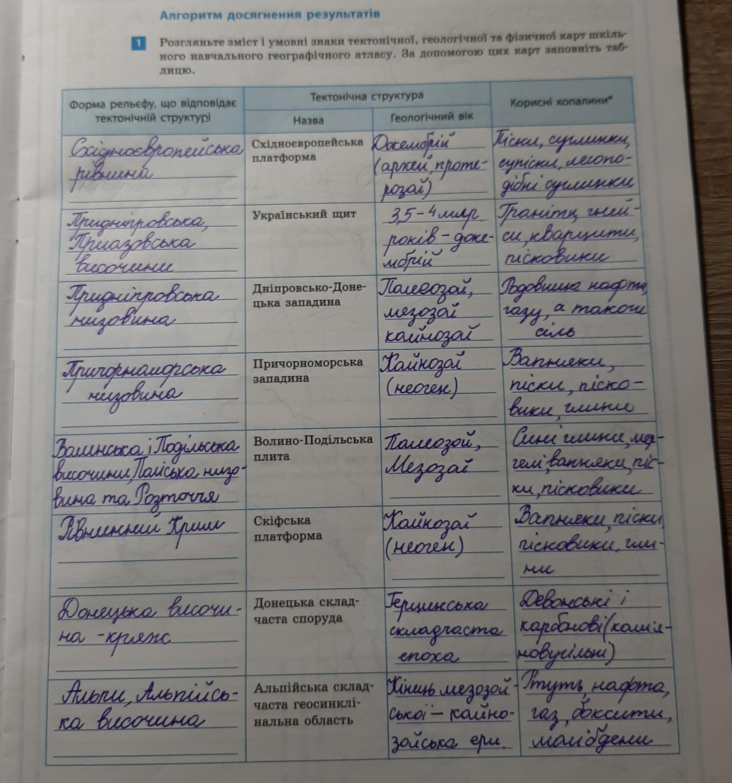 Розгляньте зміст і умовні знаки тектонічної,геологічної та фізичної карти шкільного географічного атласу.За допомогою цих карт заповніть таблицю
