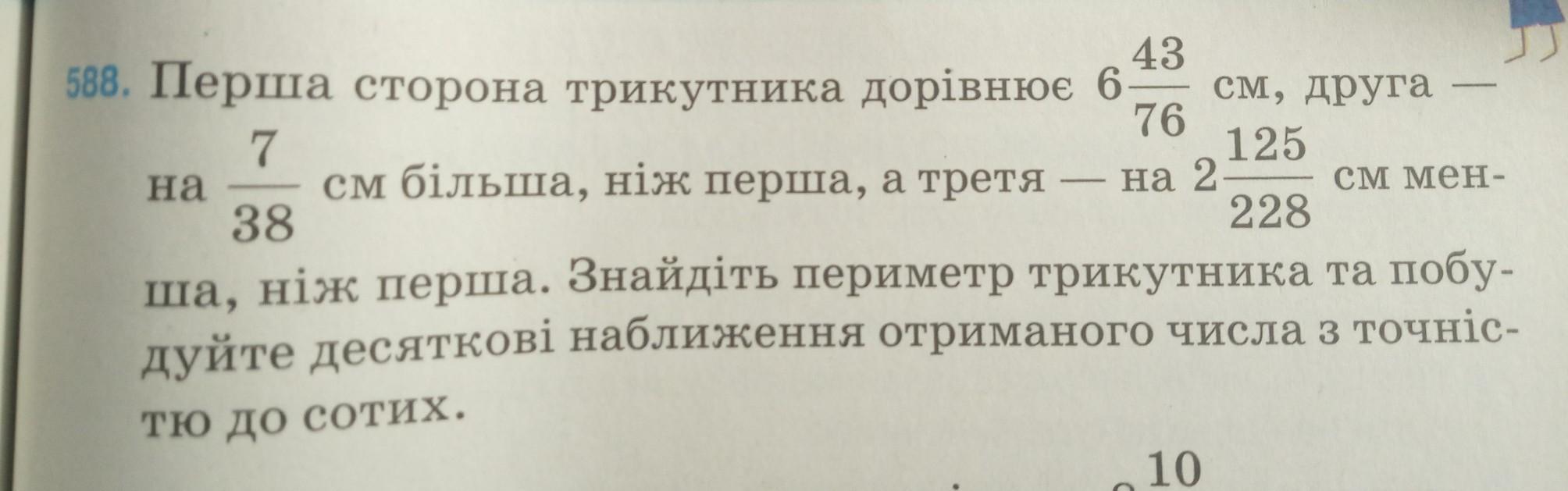 Перша сторона трикутника дорівнює 6 43/76 см, друга на 7/38 см більша, ніж перша, а третя на 2 125/228 см менша ніж перша. Знайдіть периметр трикутника та побудуйте десяткові наближення отриманого числа з точністю до сотих. СРОЧНО З ПОЯСНЕННЯМ ДАМ 70 балів
