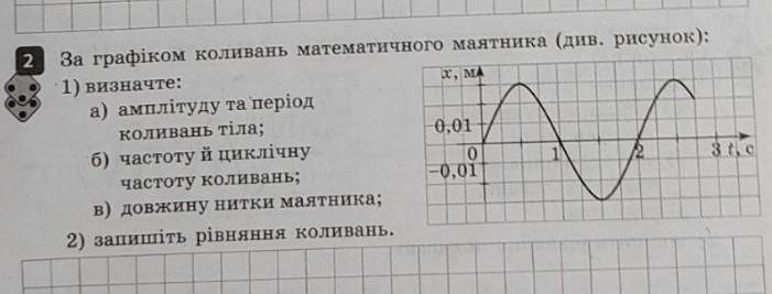 За графіком коливань математичного маятника (див. рисунок): 1) визначте: X, MA а) амплітуду та період коливань тіла; б) частоту й циклічну частоту коливань; в) довжину нитки маятника; 2) запишіть рiвняння коливань. 0,01 0 -0,01