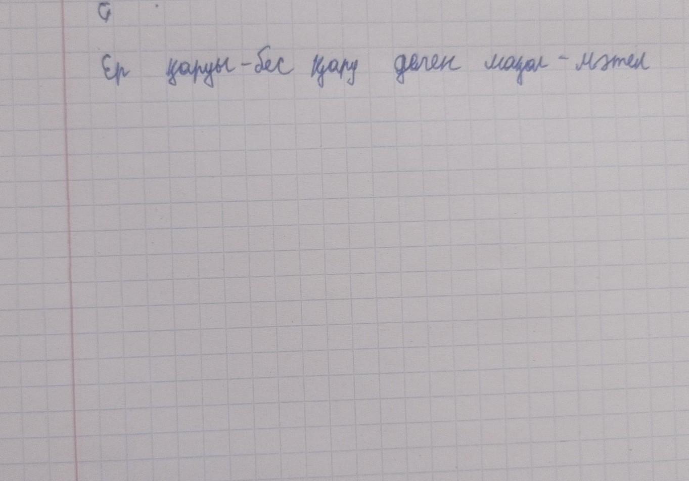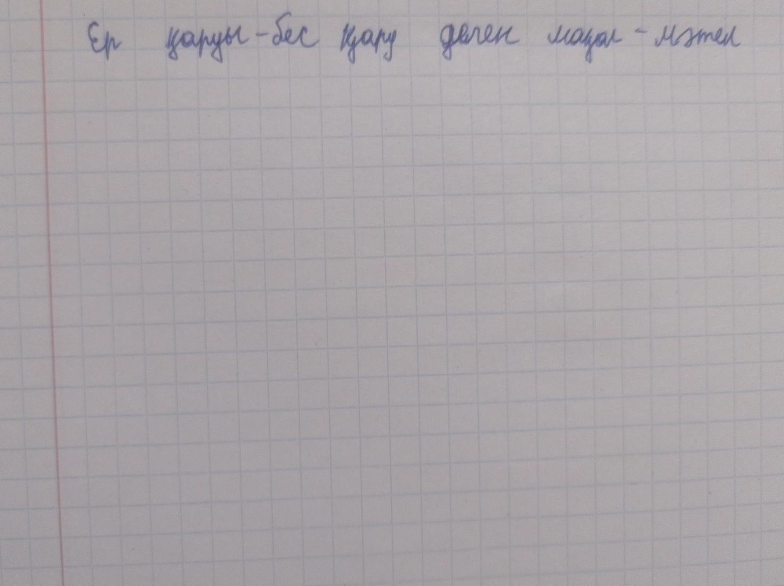 Шығарманың негiзгi ойын туйiндейтін мақал-мәтелді белгіле. Ер қаруы - бес қару Жігітке жеті өнер де аз Ер мойнында қыл арқан шірімес Байлық – қанағат пен еңбекте