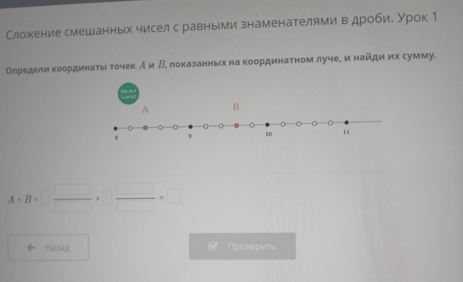Сложение смешанных чисел с равными знаменателями в дроби. Урок 1 Определи координаты точек А и В, показанных на координатном луче, и найди их сумму. A + B =