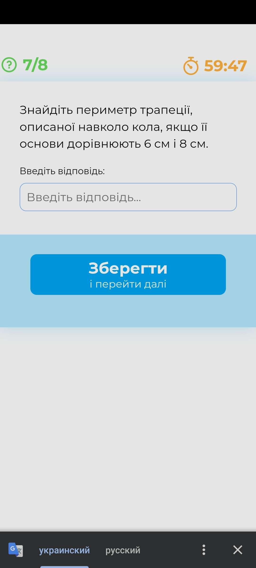 Знайдіть периметр трапеції описаної навколо кола, якщо в основи дорівнюють 6 см і 8 см