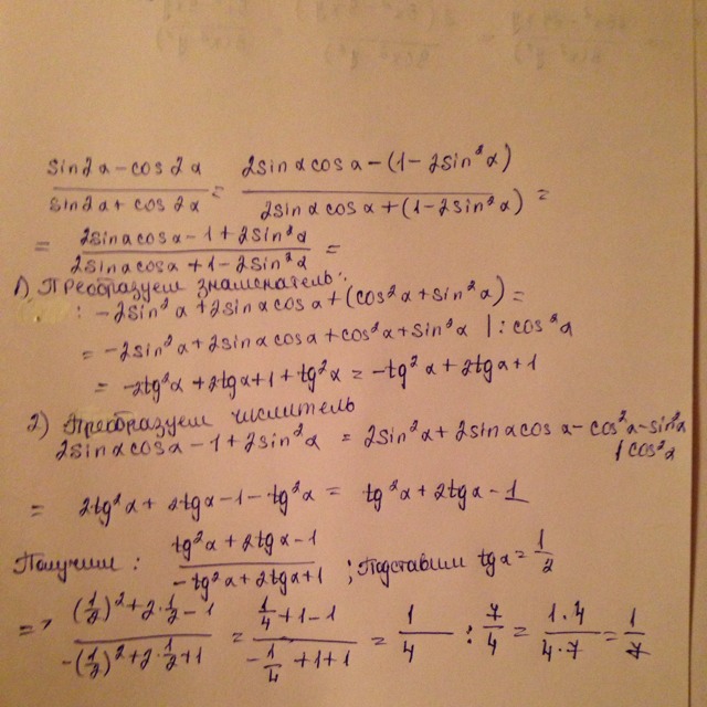 Разделем и числитель , и знаменатель на cos2a => tg2a - 1 / tg2a + 1; По формуле tg2a = 2tga/ 1 - tg^2 a = > (2tga / 1 - tg^2a) - 1 / (2tga/1 - tg^2a) + 1 Подставляем значение tg = > получаем 1/7