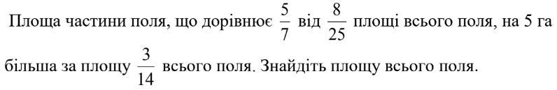 Площа частини поля, що дорівнює 5/7 від 8/25 площі всього поля, на 5 га більша за площу 3/14 всього поля.
